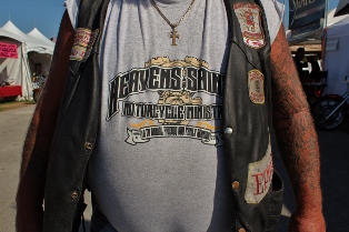 Tattoos, Leather Vests and God: A Look at a Motorcycle Ministry's Blessing of the Bikers ![]() March 17, 2014 | WMFE, Orlando - Thousands of bikers are on their way back from Daytona Beach's yearly Bike Week, which wrapped up Sunday. But a few of them will leave with more than just a tan. Bobby Milne of Heaven's Saints Motorcycle Ministry stands outside the group's tent on Thunder Alley in Daytona Beach. The group performed a 'Blessing of the Bikers' on the last Saturday of Bike Week. Photo: Carmel Delshad | WMFE. It’s not every day that you see members of a ministry tatted up from the neck down. But then again, Heaven’s Saints Motorcycle Ministry isn’t a run of the mill church group. “We look like bikers, we act like bikers, everything that they stereotype, and we’re talking about the lord,” says John Zammetti, president of the ministry. One of the group’s main functions is the Biker Blessing—a prayer to watch over any biker who wants one, says Donna Zammetti. “Most people bless bikes, we bless bikers. Because the bike is made of metal,” Donna Zammetti says. In the midst of the drinking and partying atmosphere of Bike Week, John and Donna Zammetti say they’re there to lead bikers on a different path.: “The road they’re on, at the end of that road is death,” John Zammetti says. His wife, Donna, adds: “Most of us came out of that lifestyle, with the drinking and the drugs.” It's a far cry from where they are now. The group of 6 people form a semi-circle, close their eyes and bow their heads as a member recites a prayer: “Bless these riders and their motorcycles, lord. Put a shield of protection around these riders and their passengers..."